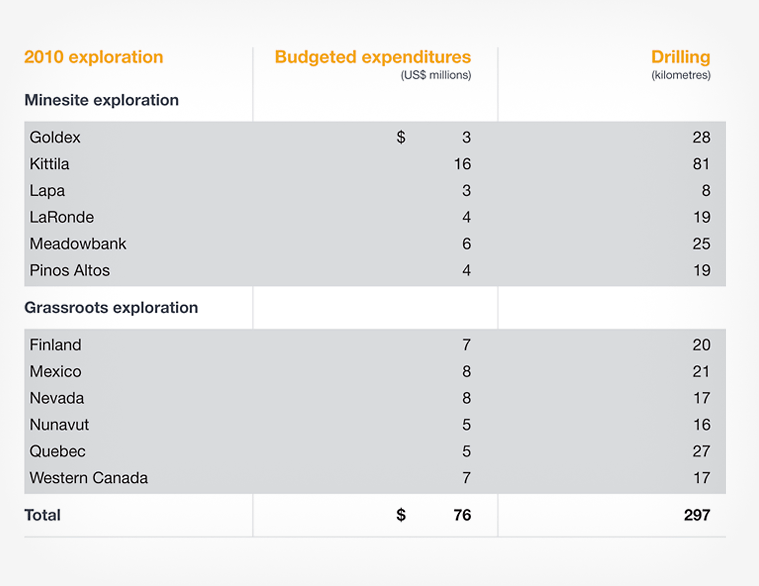 In 2010, we are increasing our exploration budget by 40% to $76 million, and planning almost 300 kilometres of drilling. The emphasis will be on resource exploration (or discovery) and conversion.