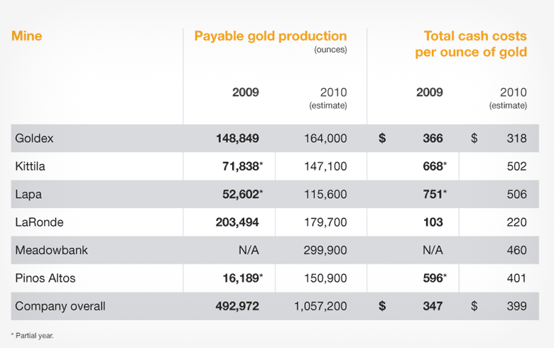 With Lapa, Kittila and Pinos Altos achieving commercial production in 2009, AEM’s five operating mines produced a record 492,972 ounces of gold, up 78% over 2008. Despite commissioning and ramp-up expenditures, total cash costs per ounce of gold of $347 continued to place AEM’s gold production in the lowest quartile of cash costs in the industry. We also strengthened our ties to the communities in which we operate.